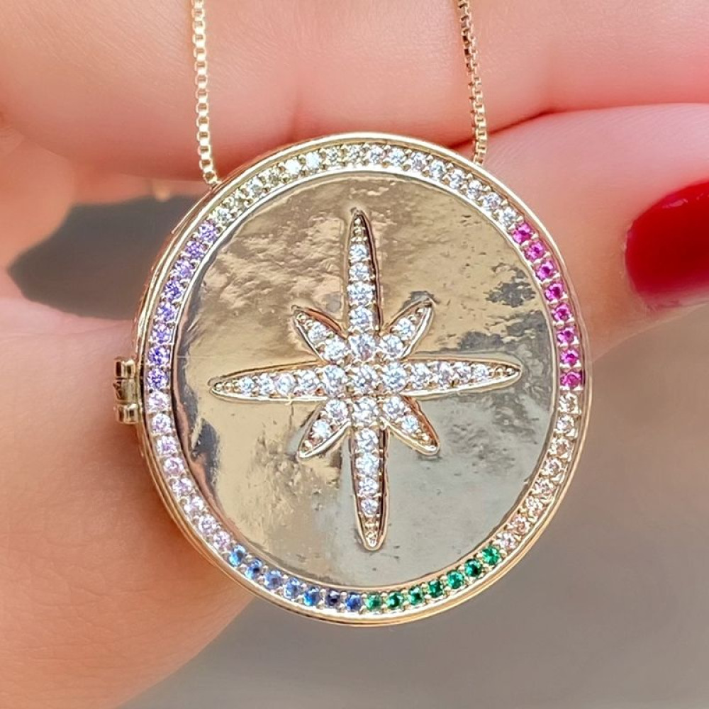 Colar com Pingente de Relicário em Mandala com Zircônias Colors na borda Estrela do Norte Cravejado em Zircônias no Centro